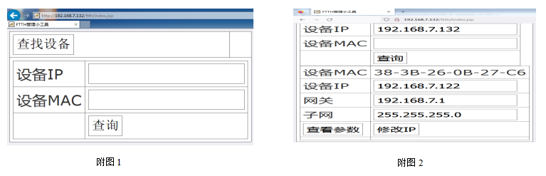 第一步:查找設備,首先在PC機上裝上FTTH網管工具,然后用網線連接設備,登錄http://192.168.7.132/ftth/index.jsp,PC機顯示工具查找界面,詳見附圖1