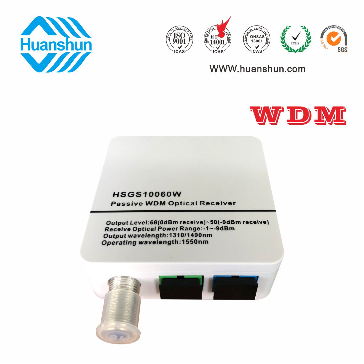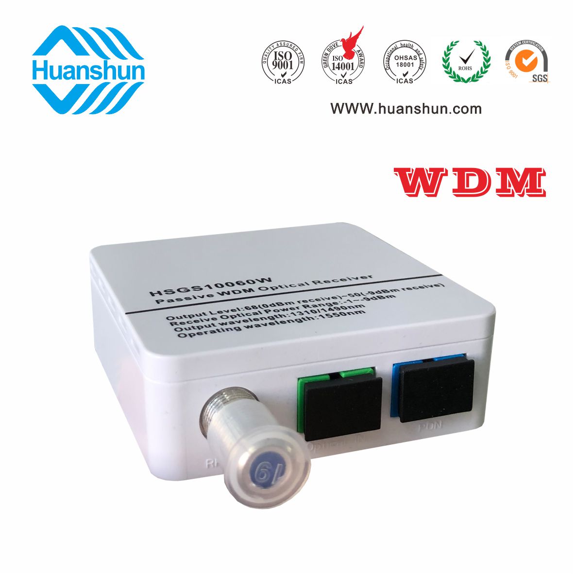 HSGS10060W/X是針對有線電視行業的特殊需求而開發的一款新穎實用的產品。它迎合被動終端接收設備的全光網絡傳輸光纖到家庭纖維和三波,并成功實現有線模擬/數字電視信號接收和數字光通信網絡數據轉換,即插即用很方便使用,無需外部電源安全性和節能。這臺機器使用了高靈敏度與WDM光電管,當收到在9 dbm轉換50 dbuv電纜模擬(數字級別42 dbuv)水平,沒有電源,功耗,節約和靈活,適合一個纖維三波光傳輸系統應用程序,不僅可以接收有線電視光傳輸信號,同時在其傳輸信號和E /GPON ONU/XPON連接。